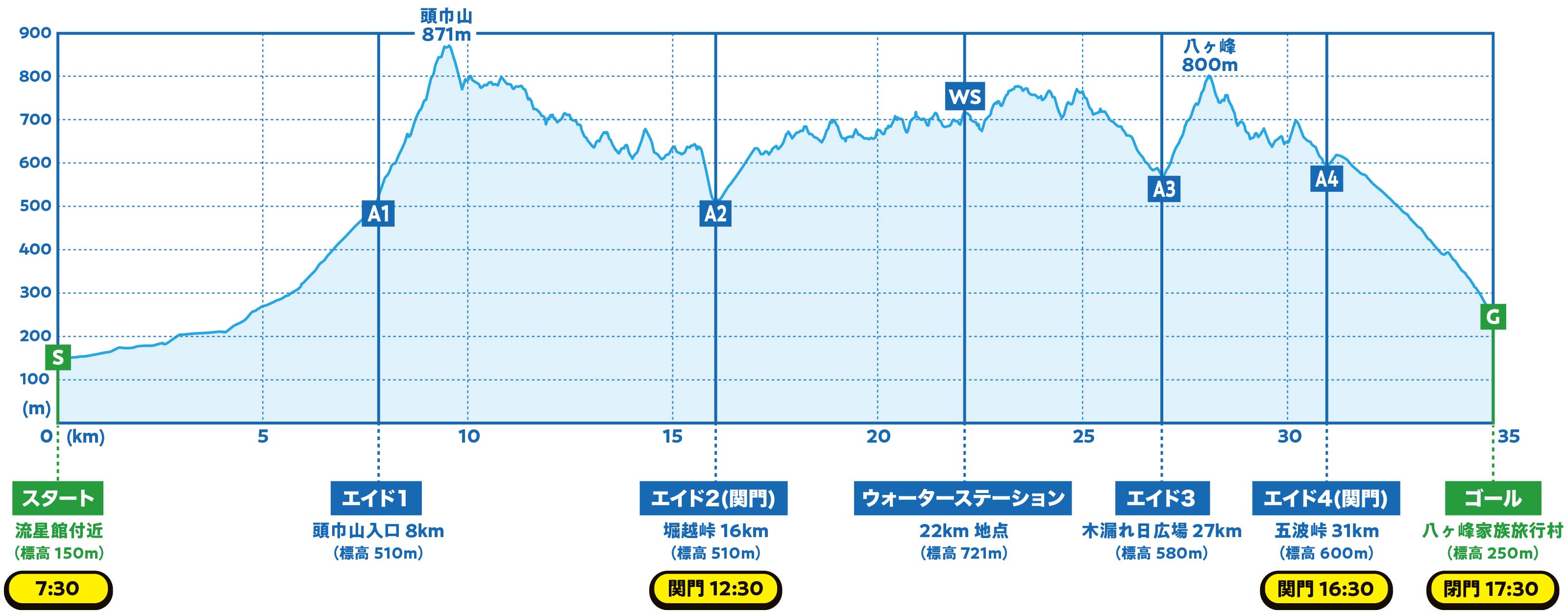 エイドは4箇所(+ウォーターステーションが1箇所)、関門は2個所です。