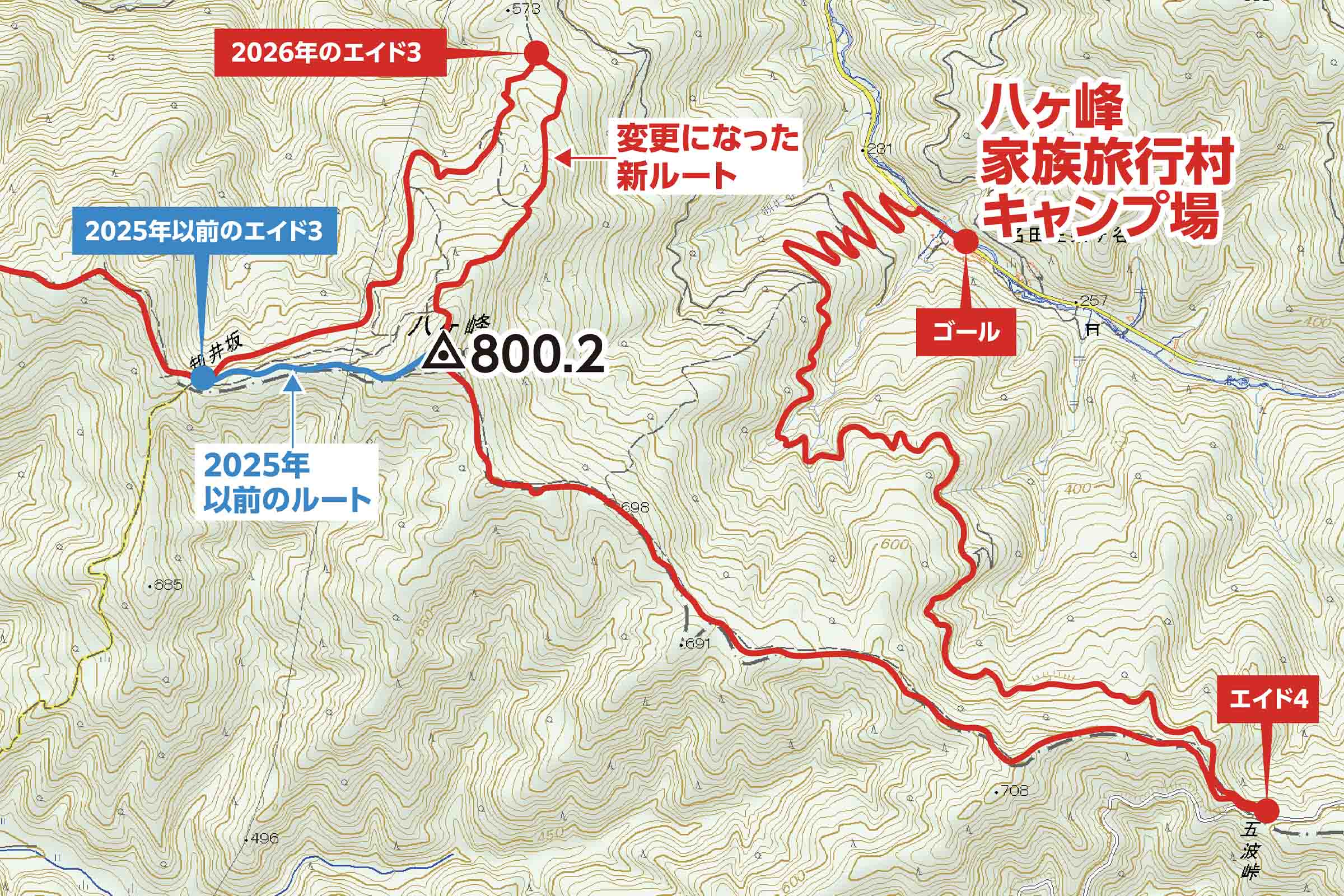【知井坂峠】から【木漏れ日広場】という場所にエイドを変更します。救護対応の改善を図るため、車両が入れる場所への変更となりました。 - エイド3の位置変更に伴い、コースの一部が変更になります。