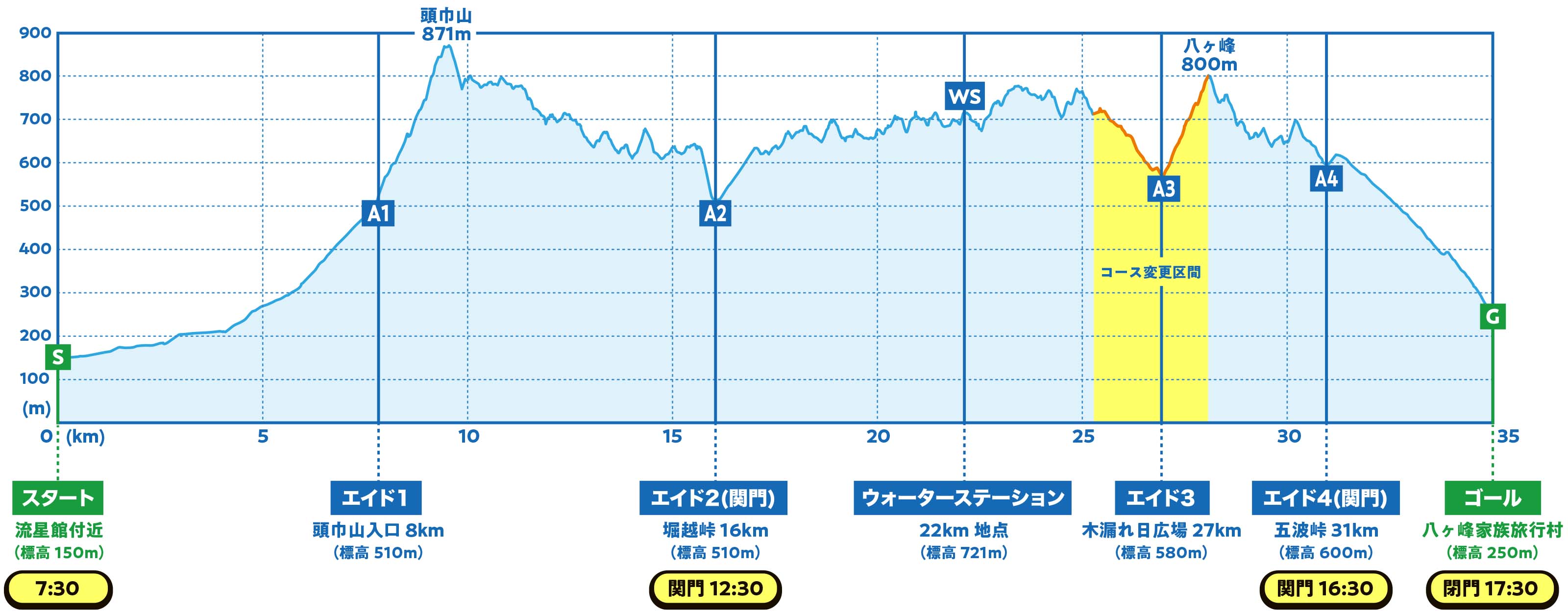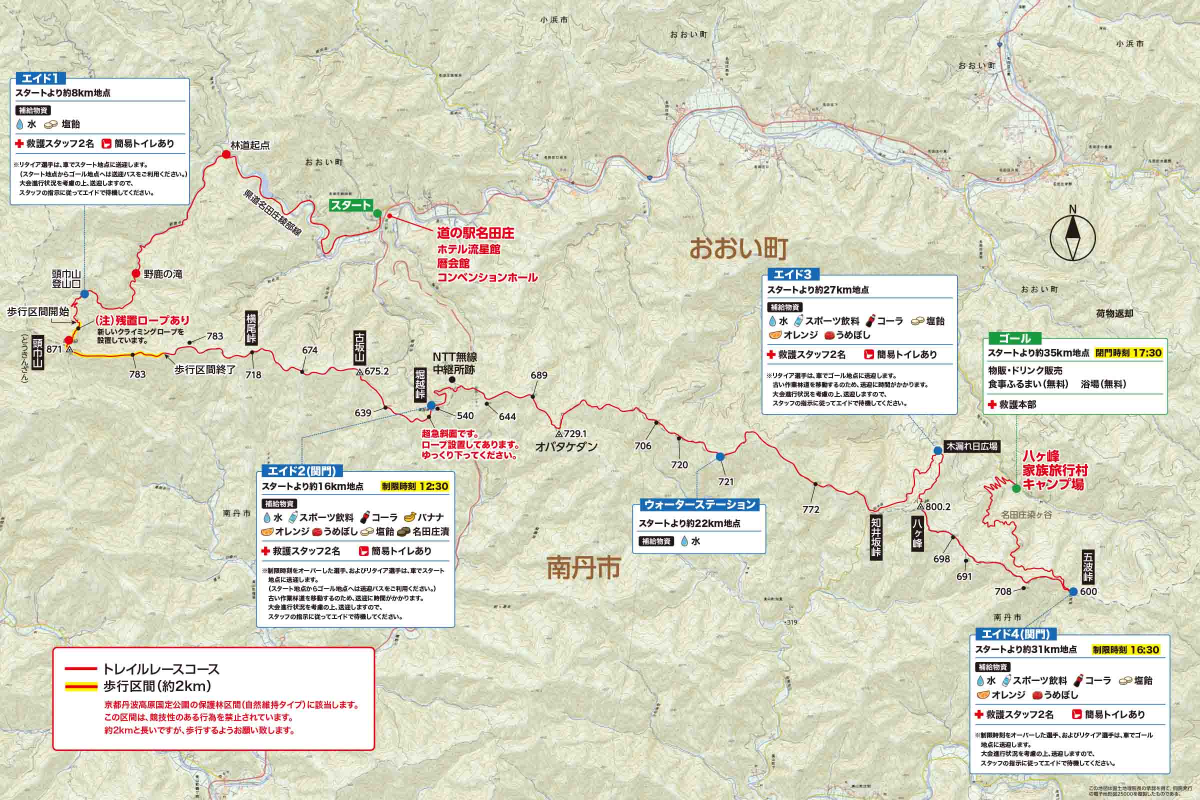 エイドは4箇所(+ウォーターステーションが1箇所)、関門は2個所です。