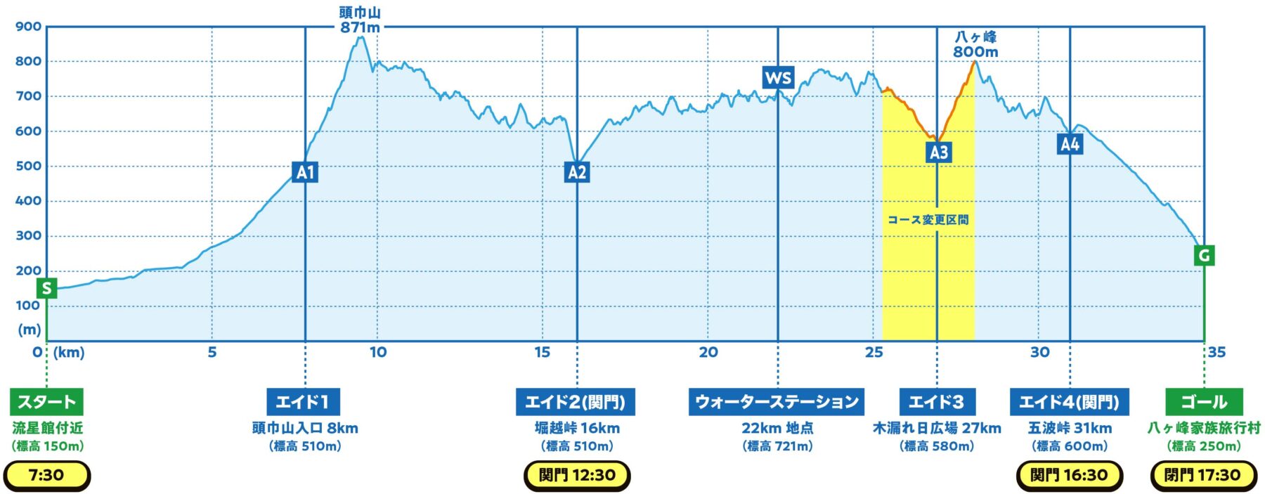 【知井坂峠】から【八ヶ峰 山頂】の区間がコース変更となります。
